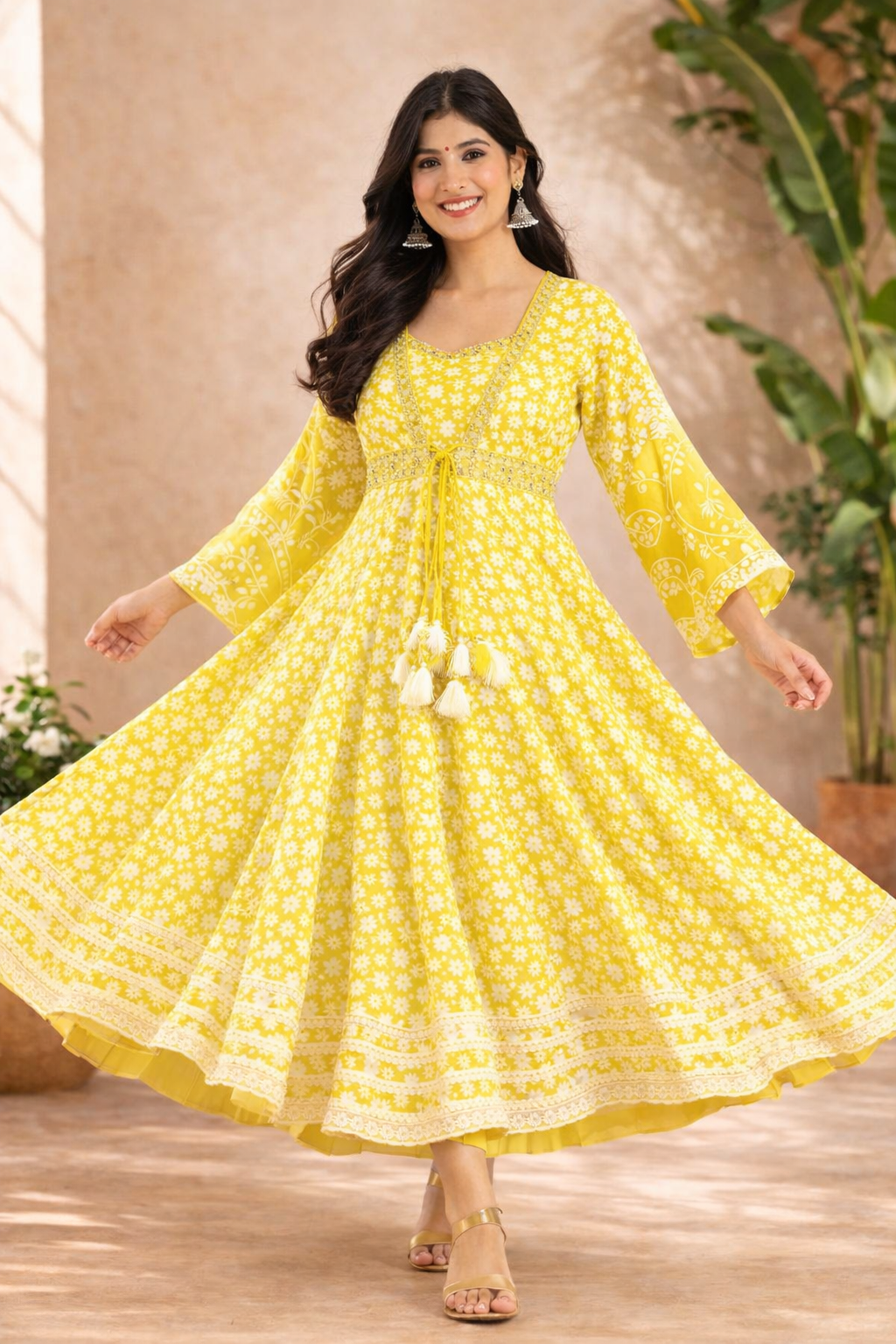 Women Yellow Floral Anarkali Kurti – Elegant Ethnic Wear