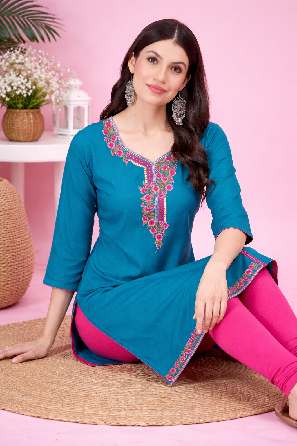 Featuring intricate floral embroidery on the neckline, this kurti blends modern style with traditional charm.