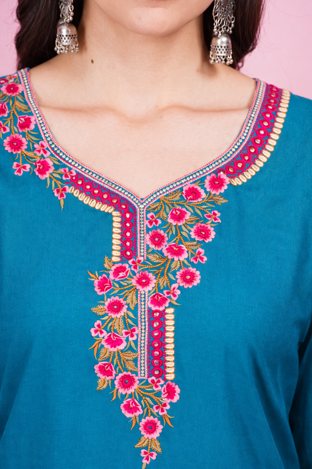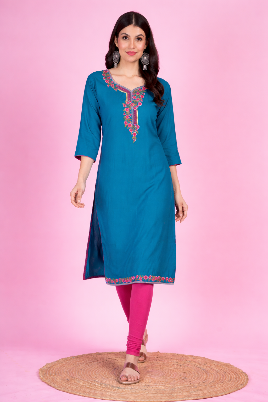 delicate floral embroidery on the neckline that enhances its ethnic appeal.