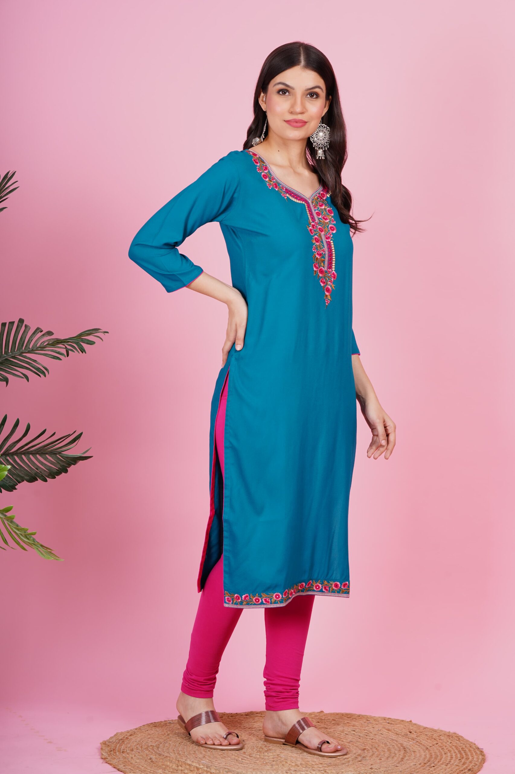 Turquoise blue embroidered straight kurti for women,
