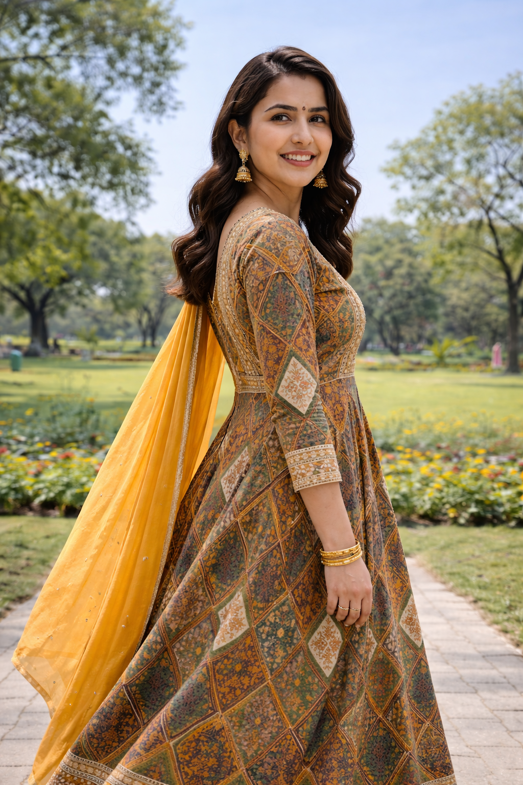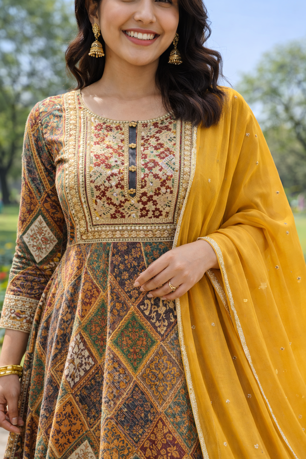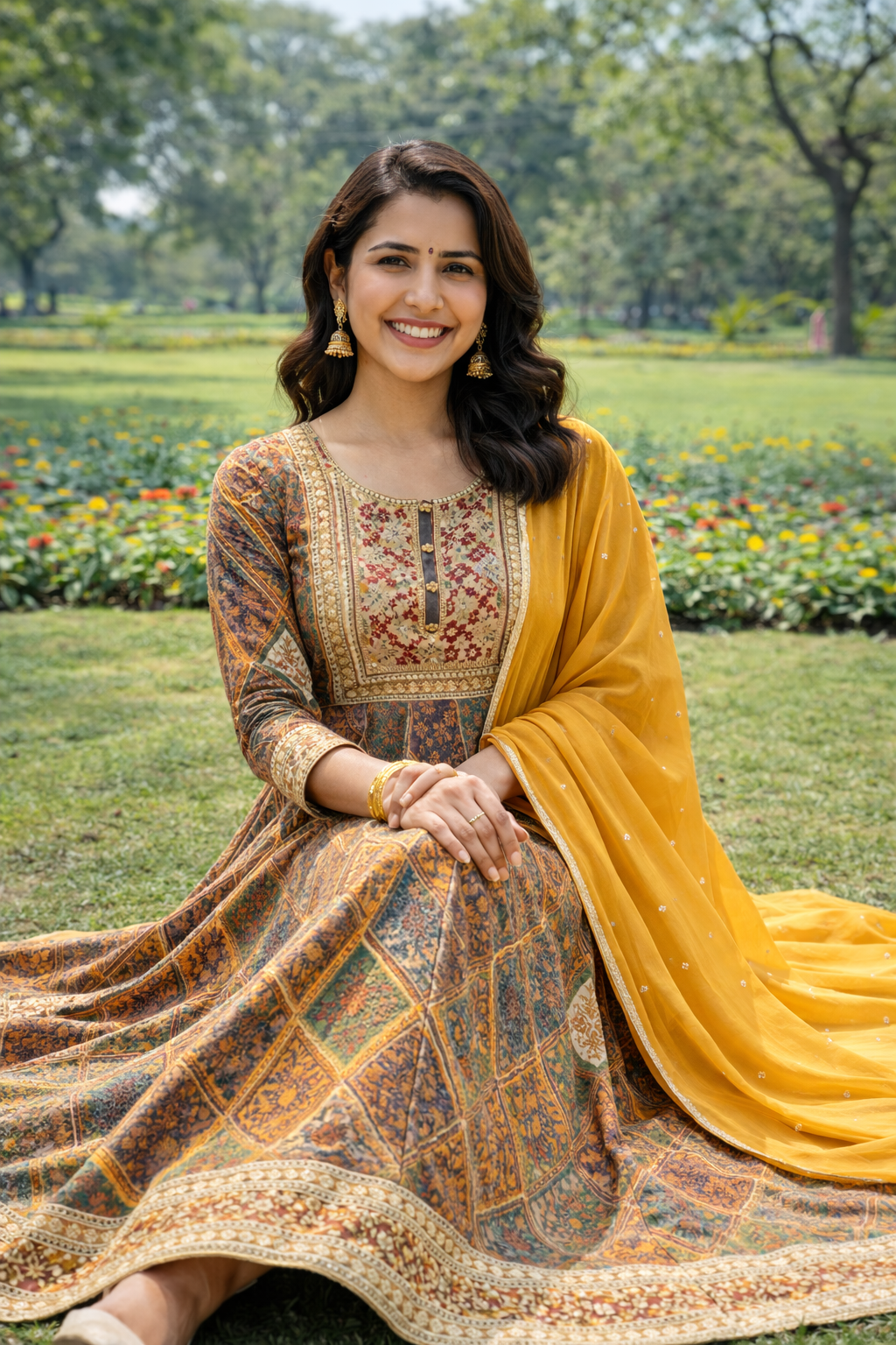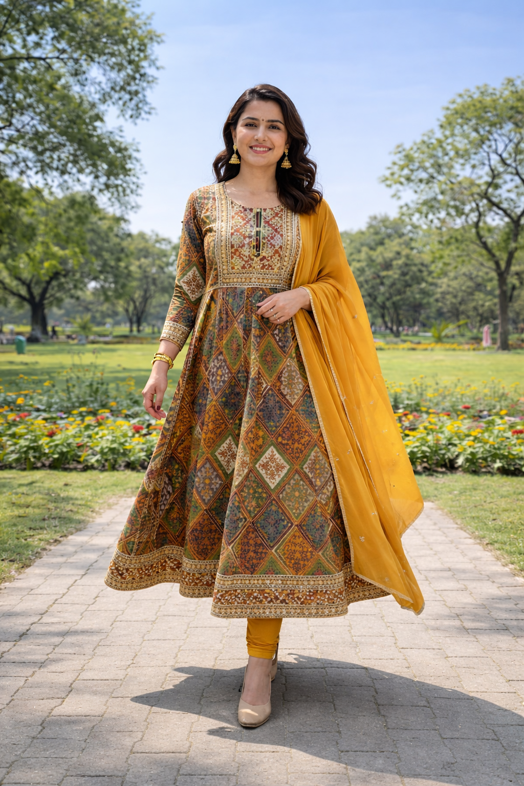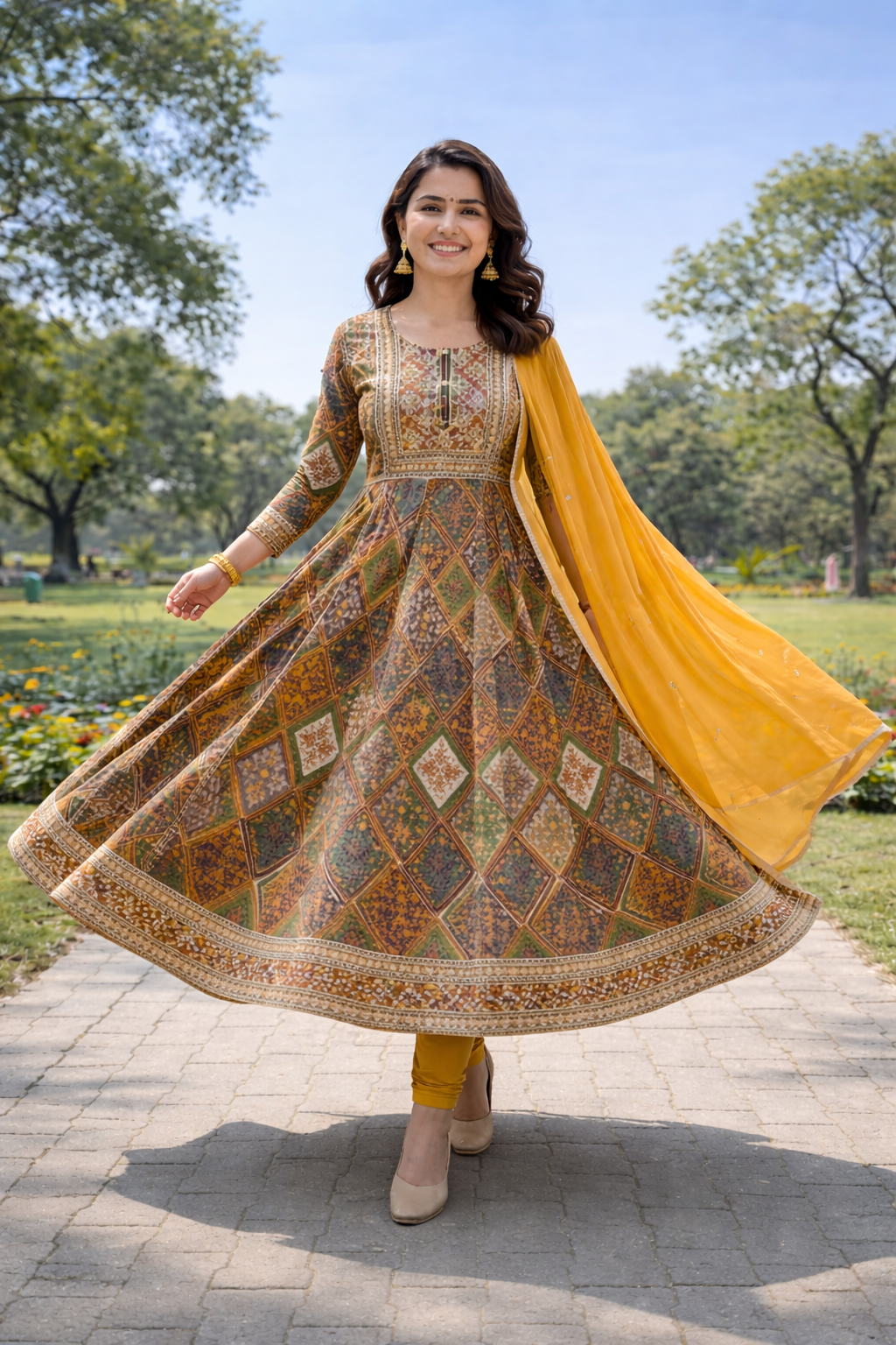This mustard Anarkali kurti set brings together intricate prints and a graceful silhouette — perfect for festive and everyday styling.