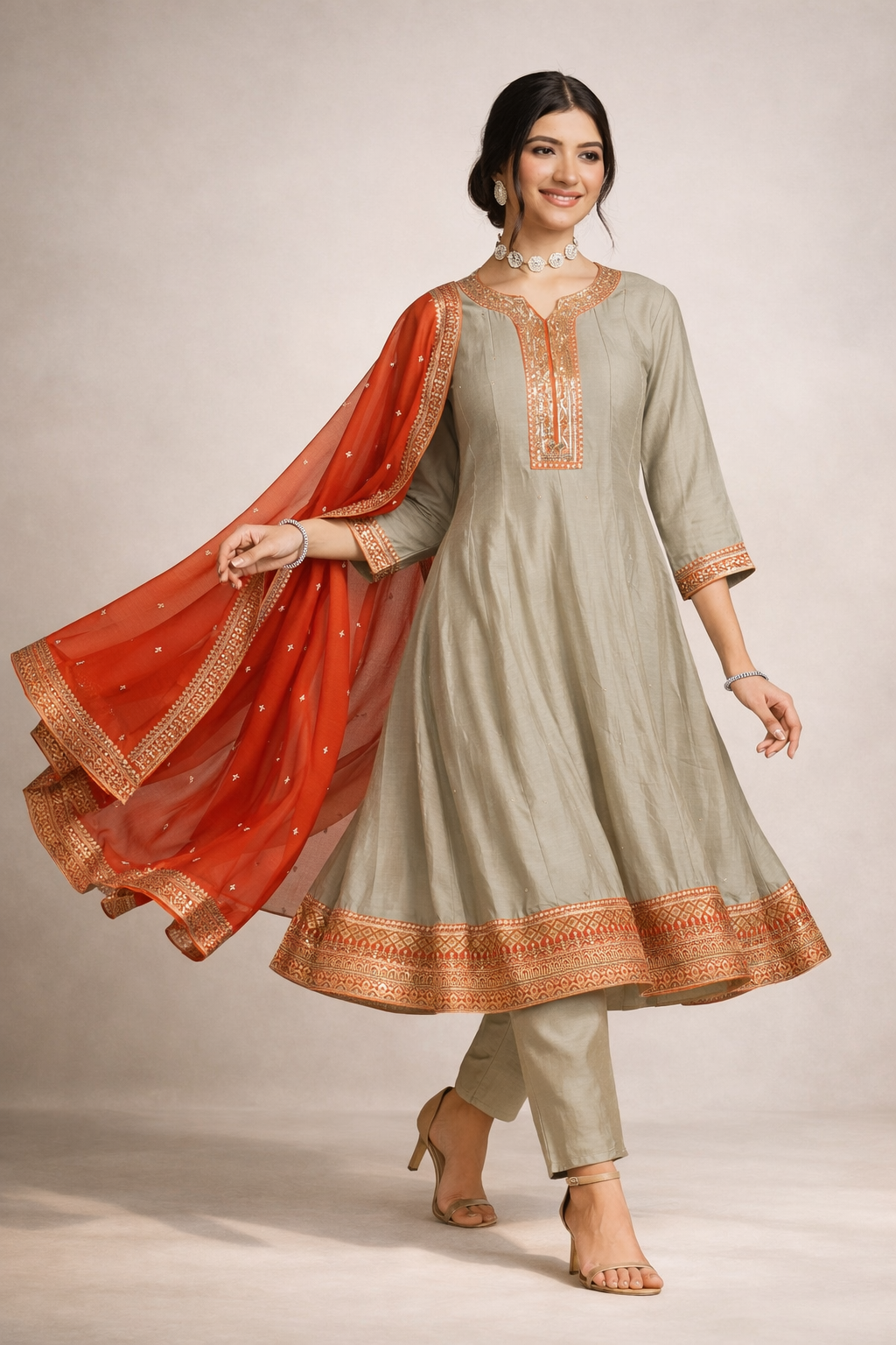 The Sage Ember Anarkali Suit is a graceful ethnic outfit designed to bring elegance and festive charm to your wardrobe. Featuring a soothing sage green Anarkali paired with a vibrant orange embroidered dupatta, this suit beautifully blends traditional craftsmanship with modern style. Perfect for festive celebrations, weddings, and special occasions, this outfit ensures comfort while maintaining a sophisticated ethnic look.