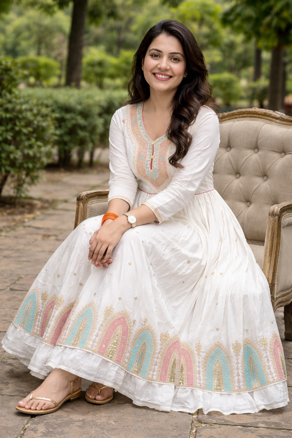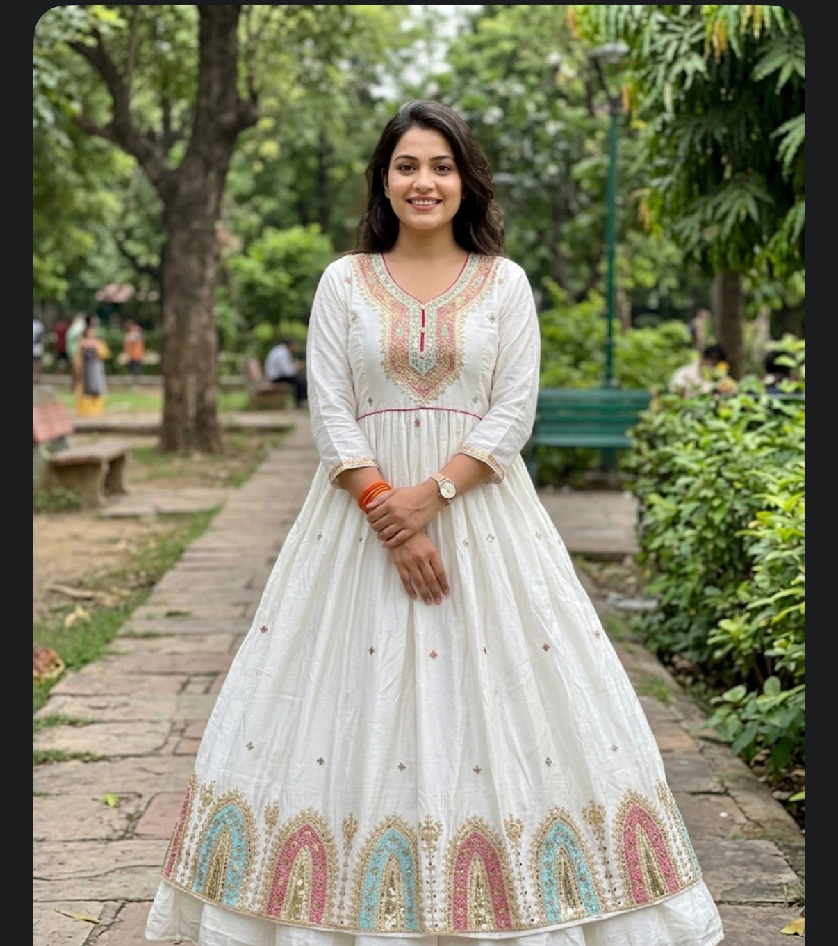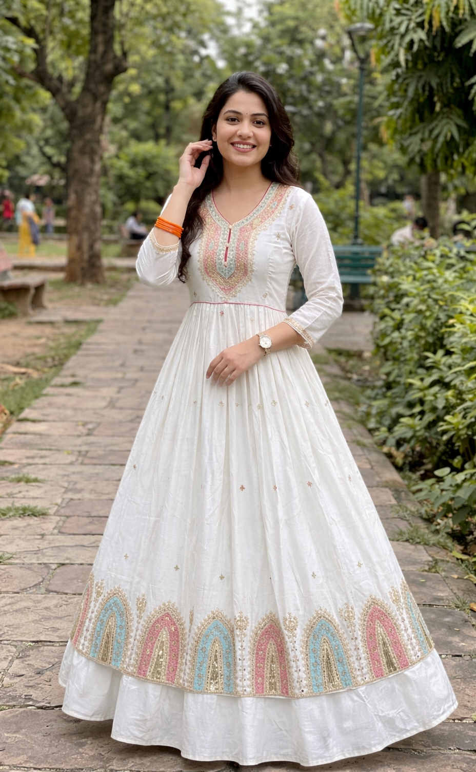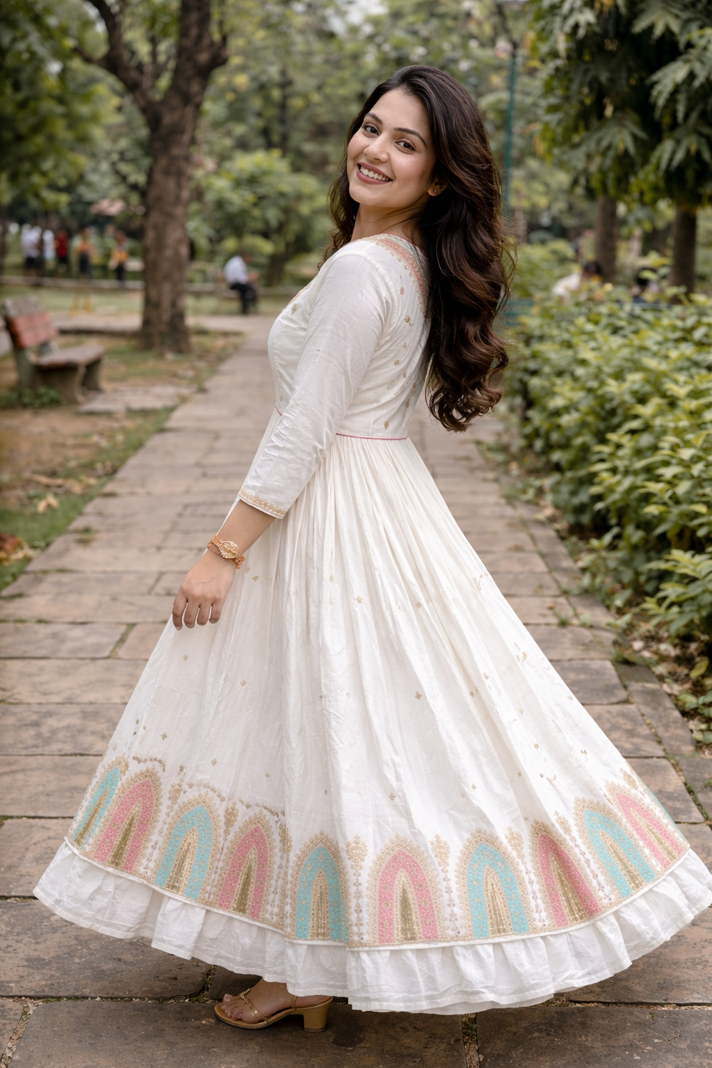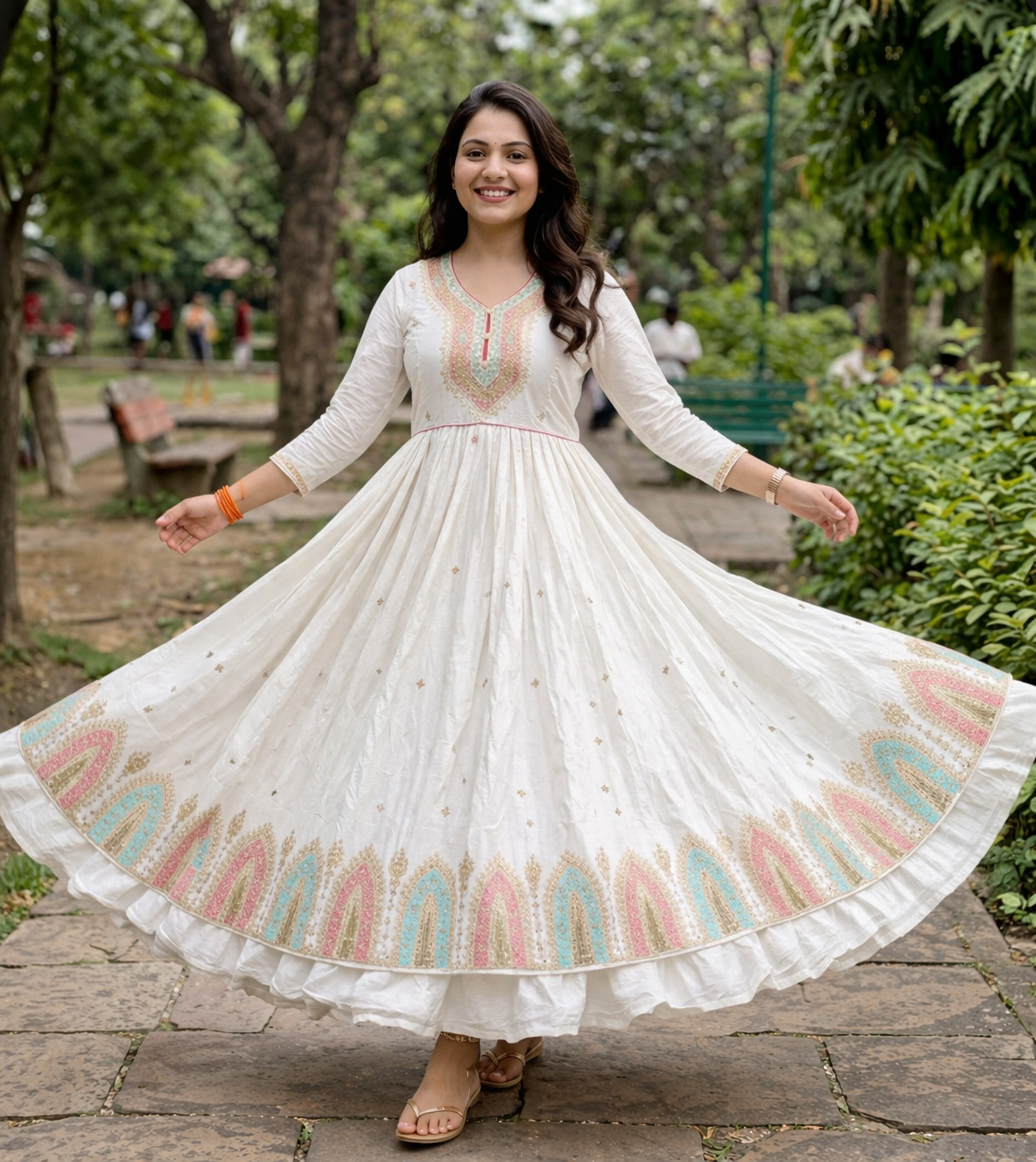 This white Anarkali suit is extremely versatile and can be styled in multiple ways. Keep it simple for a minimal look or elevate it with accessories for a more festive appearance. It’s a perfect choice for festivals, family functions, casual outings, small celebrations, and even office ethnic days.